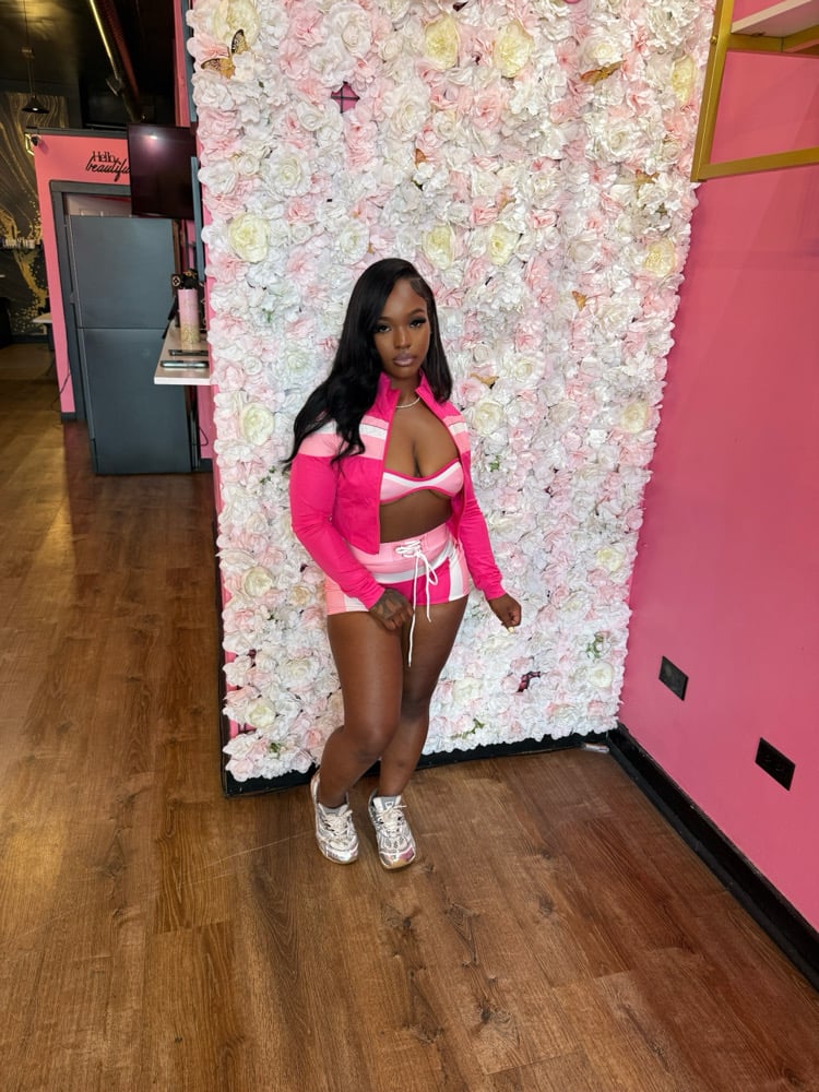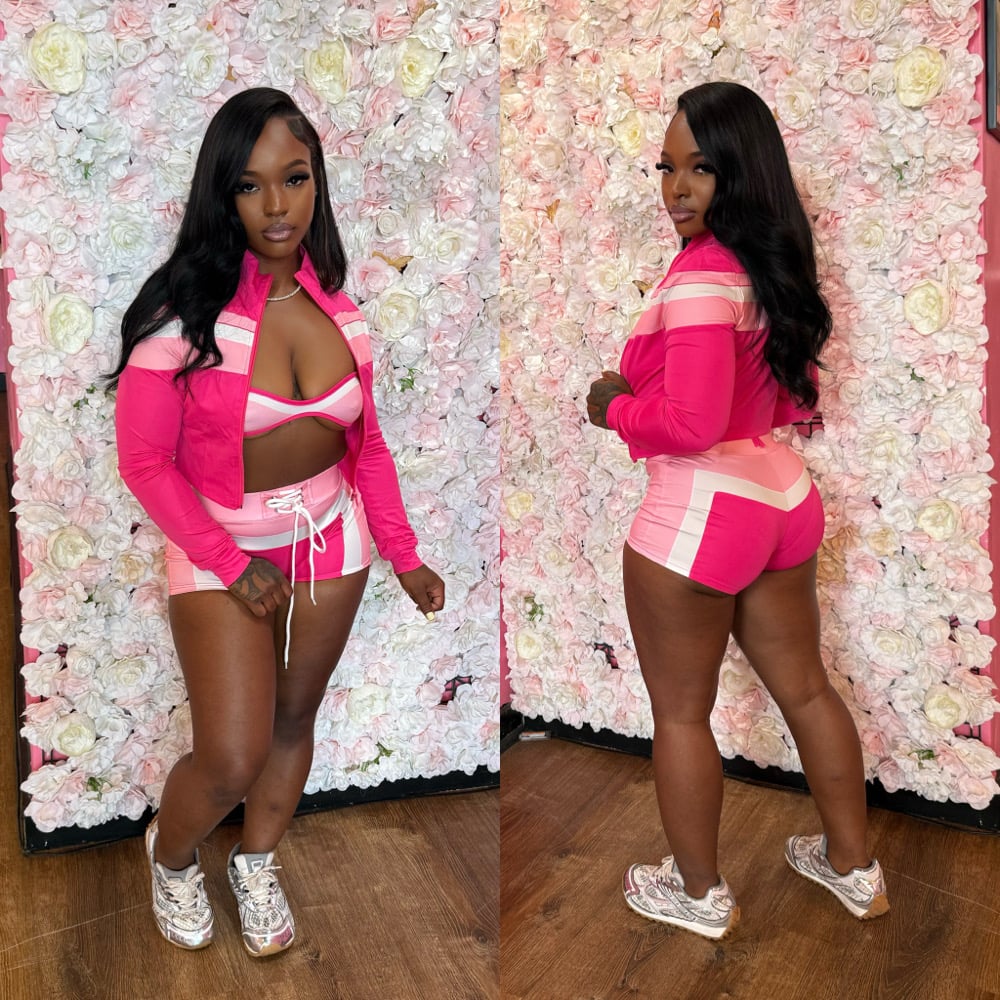 Bring the bold with our Hot Pink, Pink & White 3-Piece Short Set — featuring a fitted bra, cropped jacket, and matching shorts that serve up sweet with a side of savage. This color combo is giving confident, playful, and fully in control.